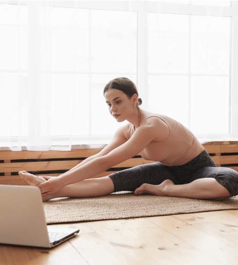 A comfortable outfit, a yoga mat, and a computer or phone are the only equipment you need.
